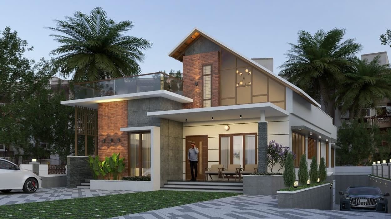 This architectural design is defined by its contemporary, multi-level façade featuring a striking mix of materials. The design incorporates large, geometric blocks with concrete finishes, warm wood paneling, and smooth, light-colored walls. The prominent corner balcony with a glass railing adds to the modern aesthetic, while the clean lines and varying textures create a bold and dynamic appearance.