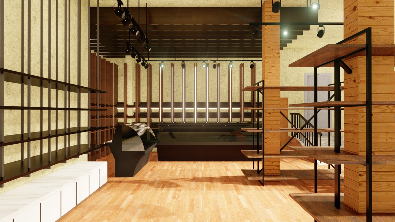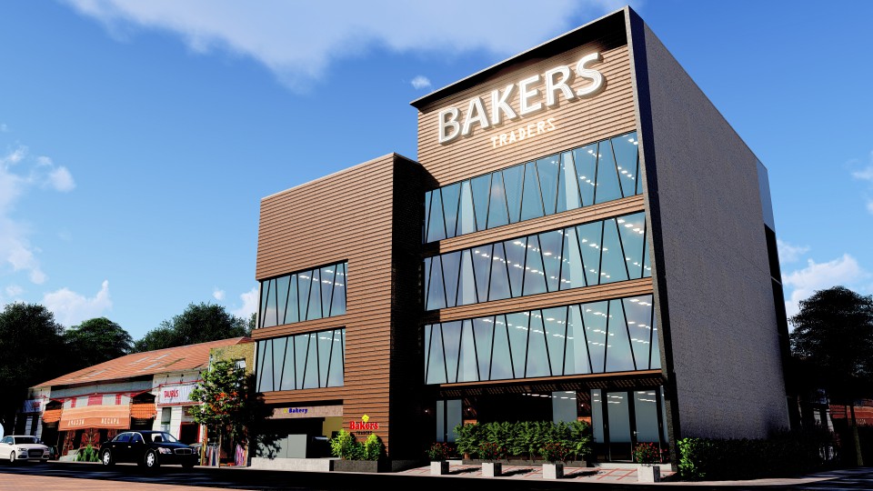 The commercial building’s design features a prominent modern façade with a striking contrast of materials. The front face is dominated by large, angled glass panels that provide ample natural light and are complemented by horizontal wood sidings, adding warmth.