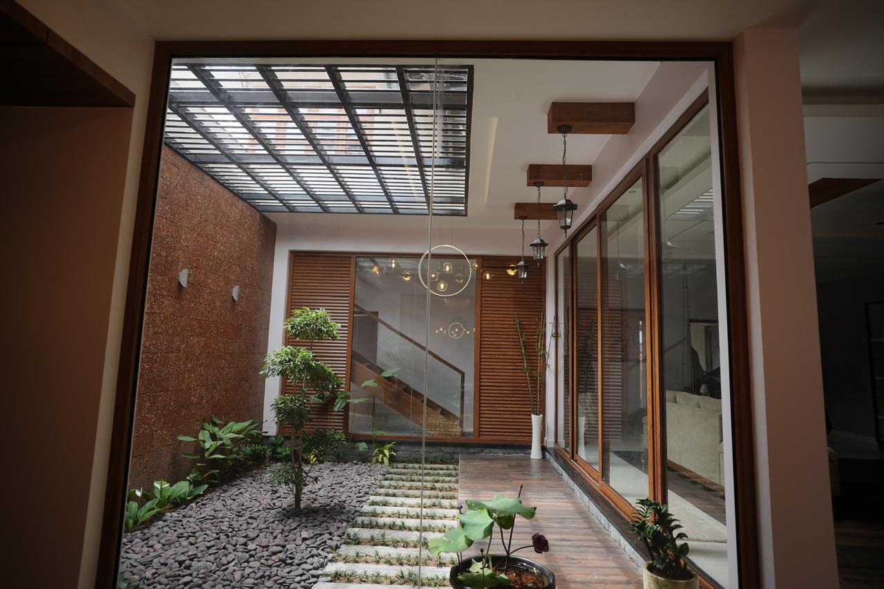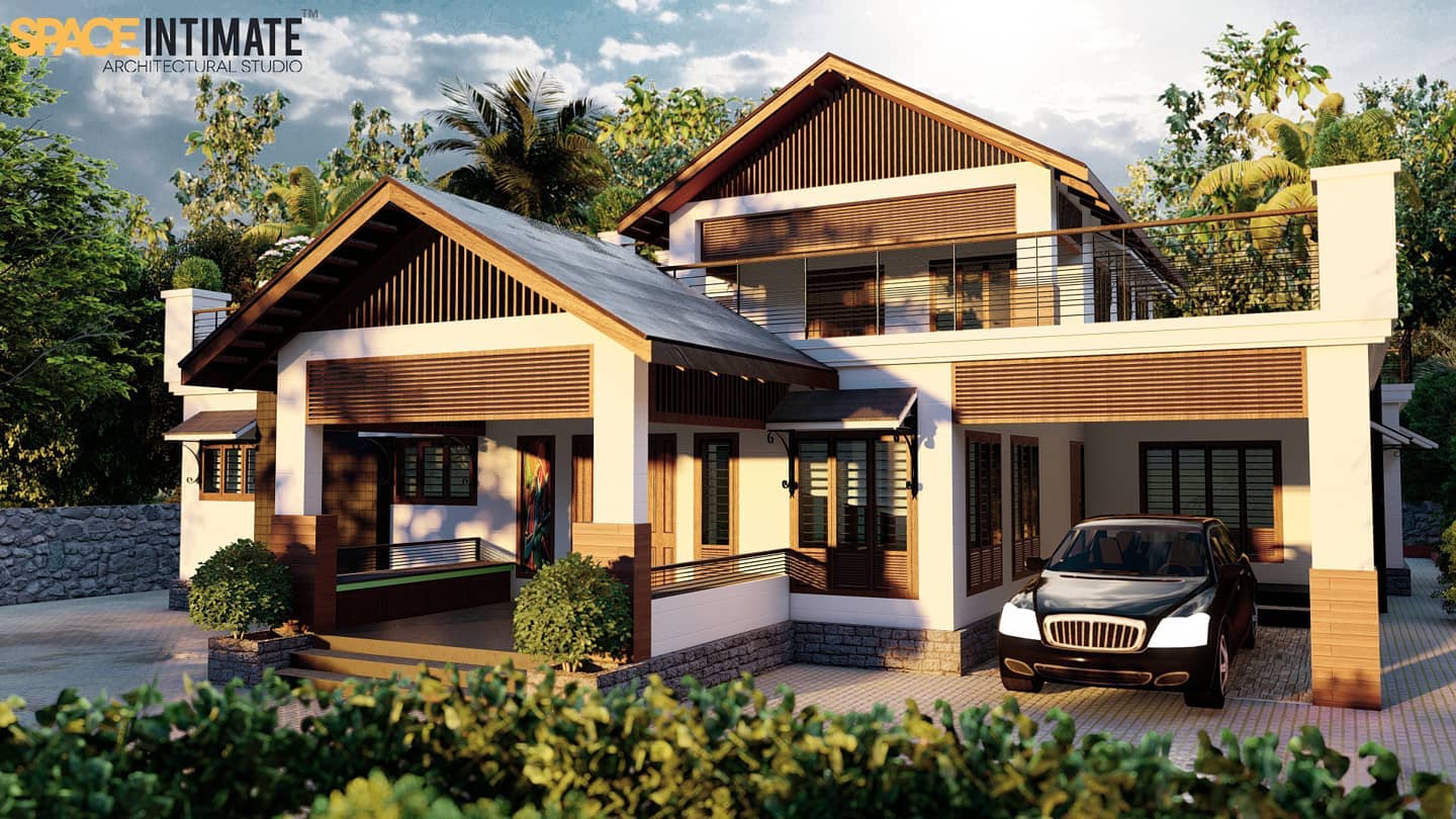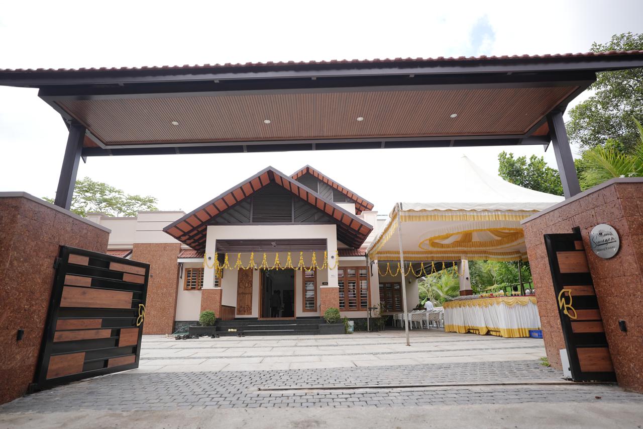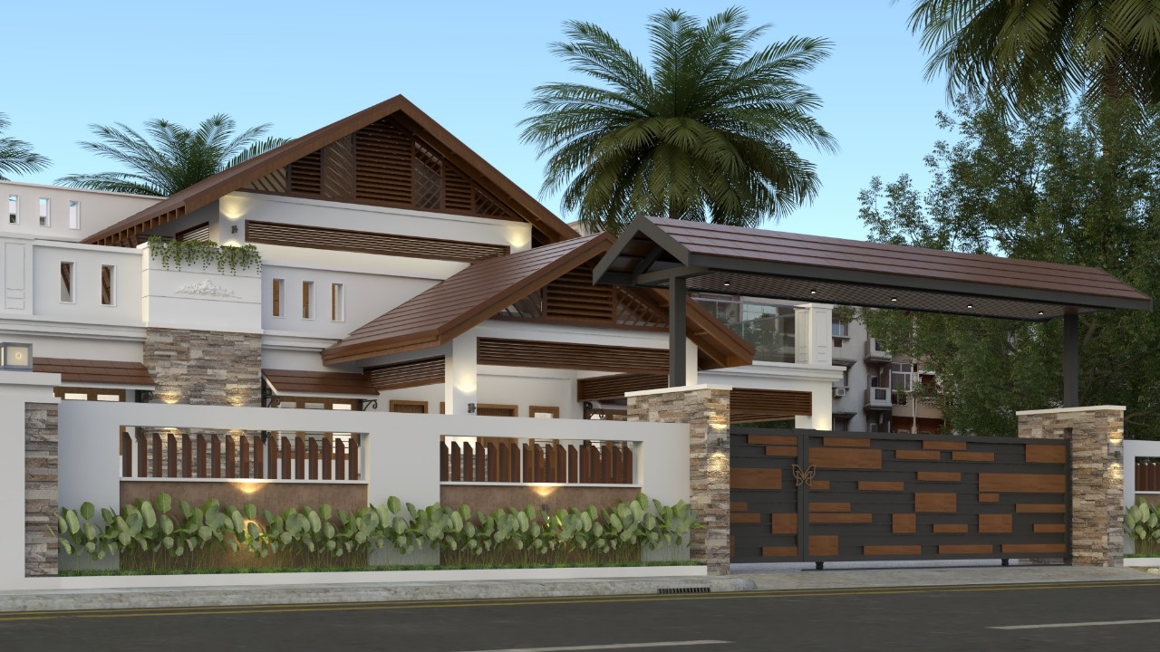 This building’s design features a traditional gable roof style that gives it a classic, pitched appearance. The façade combines several textures, including stone veneer, white plaster, and warm wood elements on the gables and eaves. The modern aesthetic is introduced through a slatted metal gate and a long, covered gateway, creating a harmonious blend of traditional and contemporary architecture.