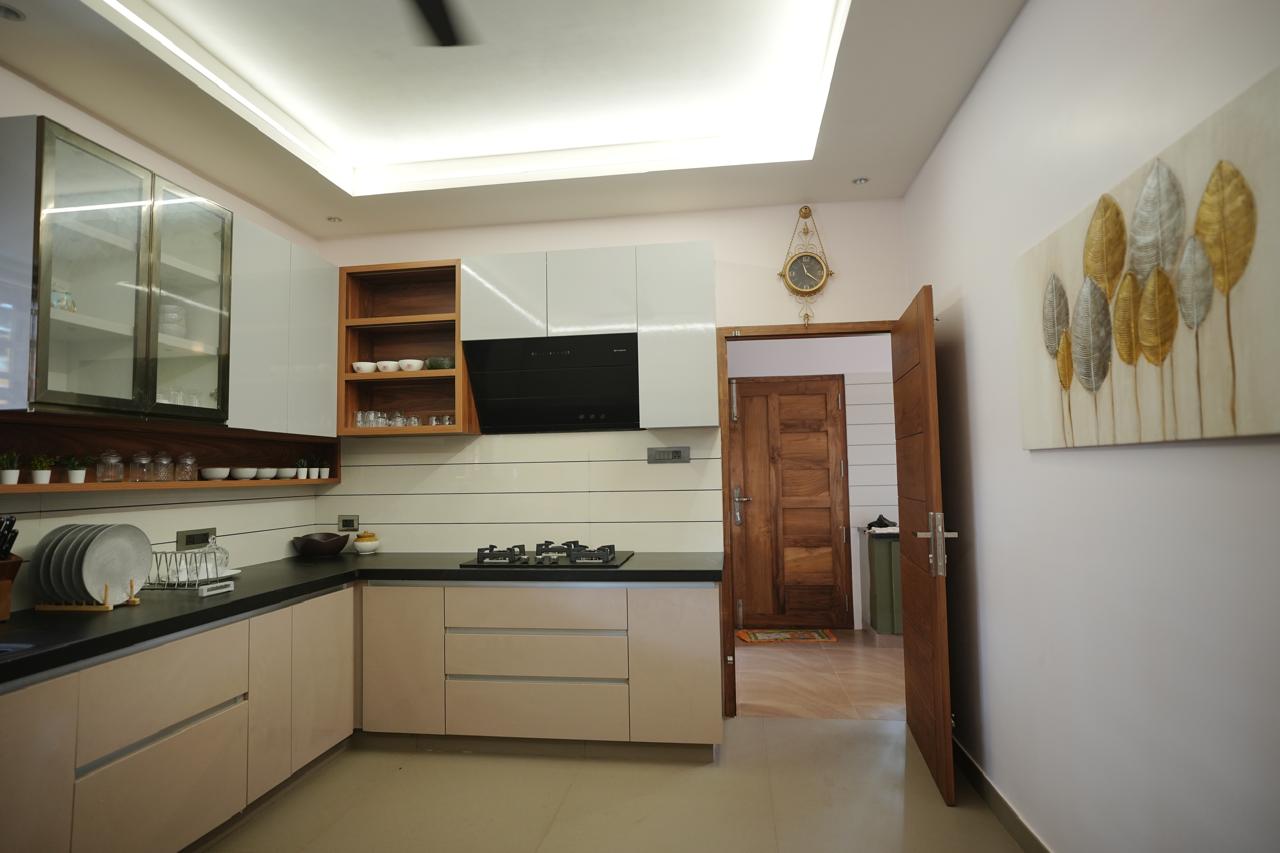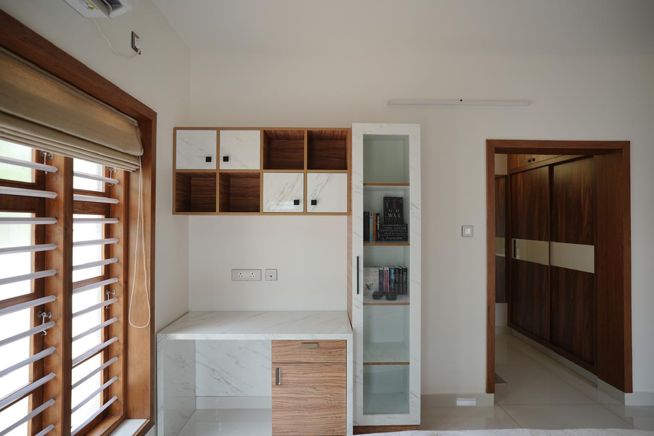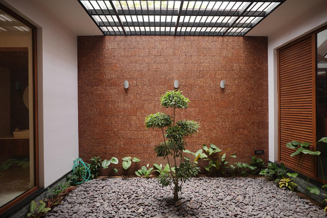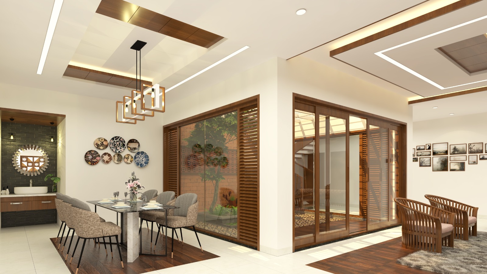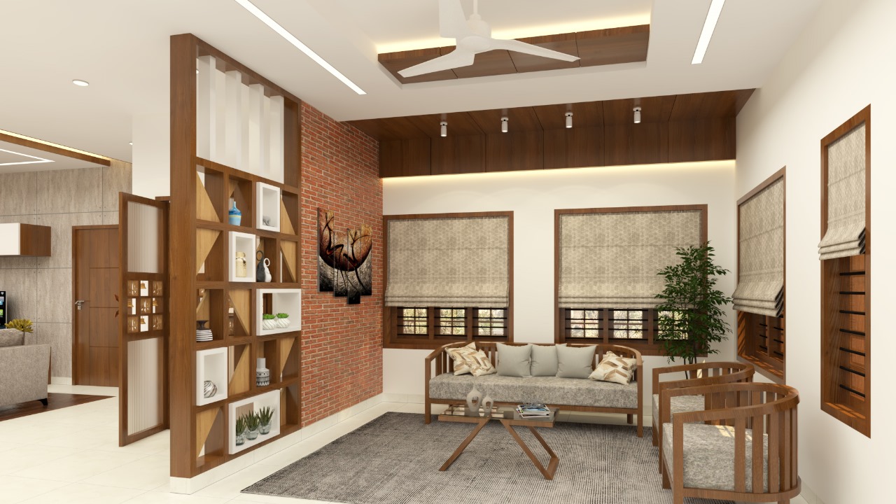 This building’s design features a traditional gable roof style that gives it a classic, pitched appearance. The façade combines several textures, including stone veneer, white plaster, and warm wood elements on the gables and eaves. The modern aesthetic is introduced through a slatted metal gate and a long, covered gateway, creating a harmonious blend of traditional and contemporary architecture.